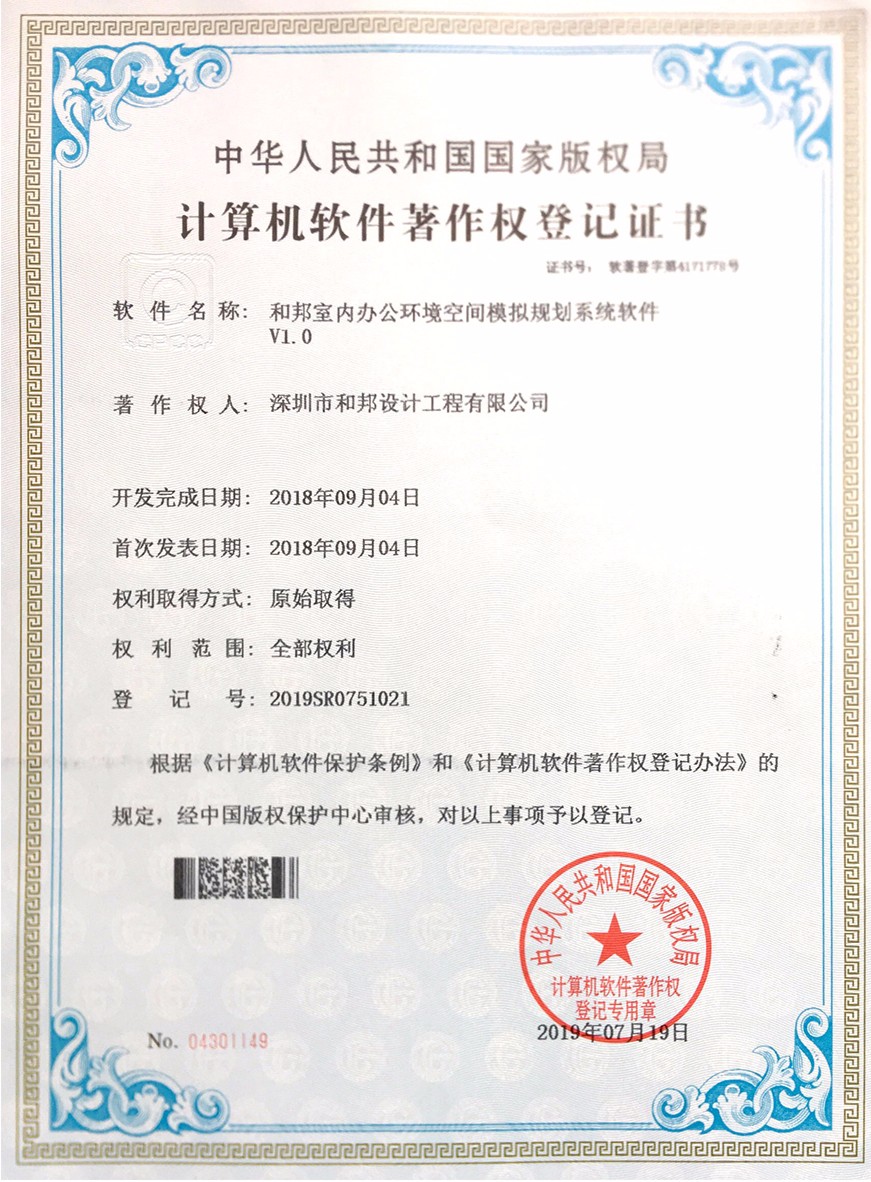 根據《中華人民共和國計算機軟件保護條例》和《計算機軟件著作權登記辦法》的規定,經中華人民共和國國家版權局審定,我公司自主研發的7款軟件被正式授予《中華人民共和國國家版權局計算機軟件著作權登記證書》,7款軟件分別為:“和邦別墅裝修效果智能優化系統V1.0”、“和邦室內辦公環境空間模擬規劃系統軟件V1.0”、“和邦別墅裝飾色彩搭配設計模擬軟件V1.0”、“和邦室內裝修效果3D模擬系統軟件V1.0”、“和邦精裝樣板房設計三維模擬系統V1.0”、“和邦別墅室內采光效果智能分析系統V1.0”、“和邦園林式別墅格局規劃設計系統軟件V1.0”。